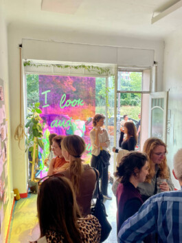 The wall paintings are made for people to step into and use as photo backdrops. Each inscription leaves an empty space, inviting participants to physically enter the work and complete its message.
